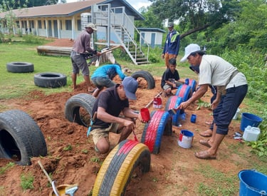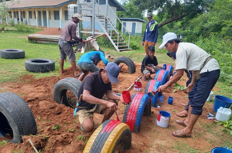 School area improvement activities, project teams have joined with parents, students, village education development board, Vocational Technical College, village technicians to implement school area improvement activities such as: making toys, the process of making traditional playground equipment (Outdoor playground/wooden swings, Douang dang) and using car tires as a playground.