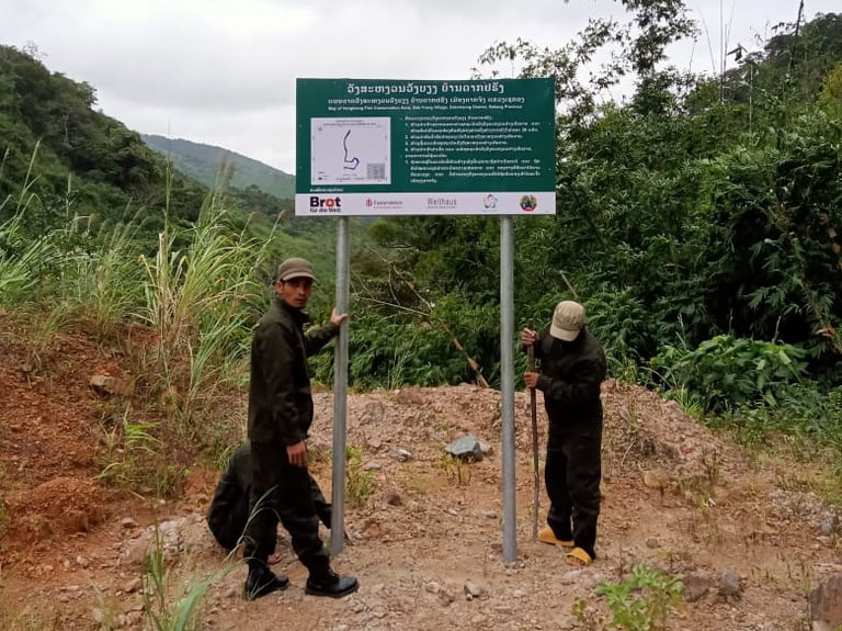Following the community access project, we also provided knowledge and awareness on the importance of natural resources, the impact of improper agricultural practices on the community’s livelihood and climate change, and the sustainable use and protection of forest products. We conducted training sessions on various topics such as natural resource management, good leadership, and gender roles. Moreover, we supported the community’s efforts to protect and manage natural resources by facilitating their establishment of the boundaries and rules of the protected area. DakXiengAh village has one forest reserve of 482 hectares, one forest for use of 628 hectares, and one palace of 2.5 hectares. We also facilitated the formation of a 16-member village reserve management committee and provided them with 16 sets of patrol equipment.